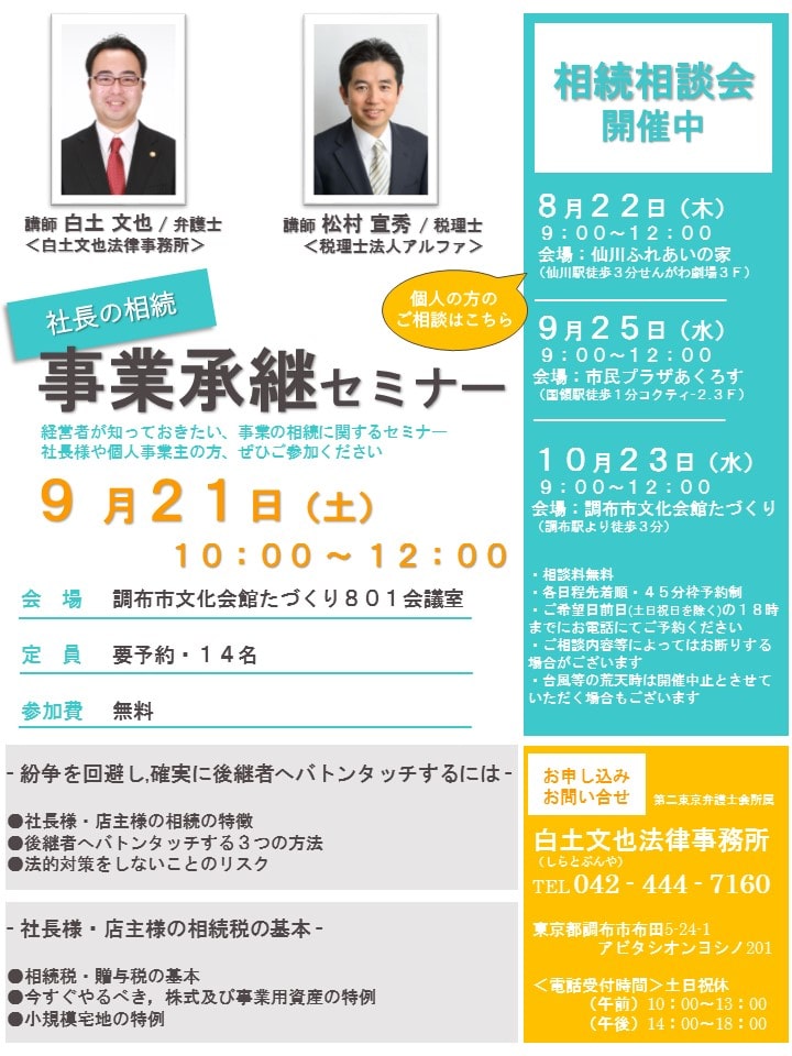 白土文也弁護士(白土文也法律事務所)と、事業承継セミナーを行います。